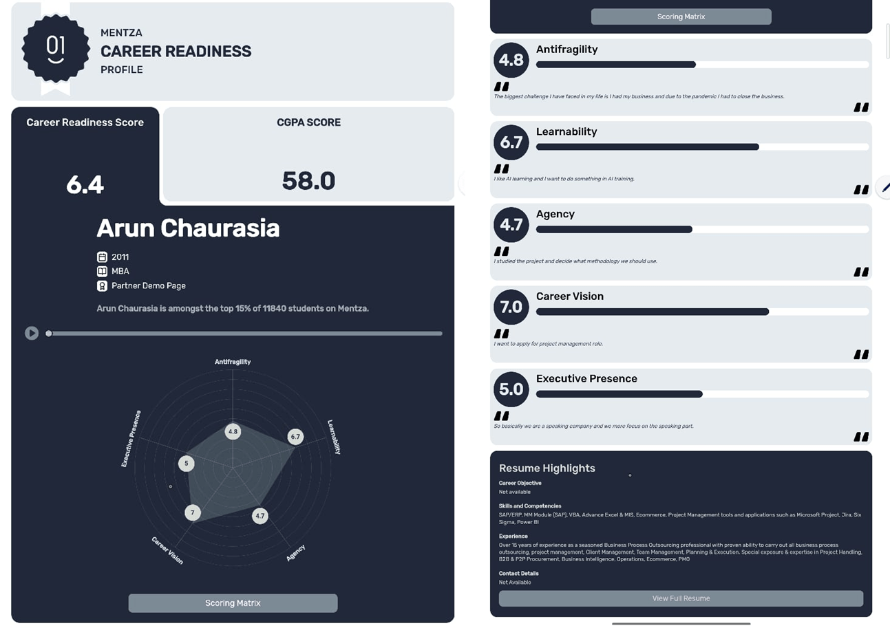 Share your scores on Antifragility, Learnability, Agency, Career Vision, and Executive Presence directly with recruiters.